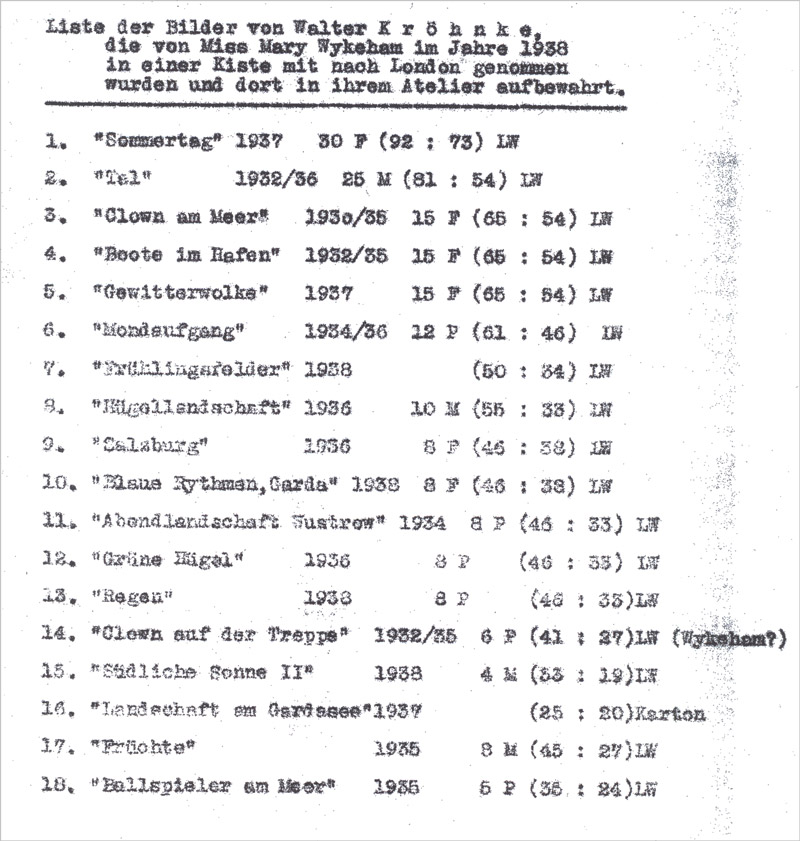 Walter Kröhnke, German painter, 1903-1944, who worked in a style, which was not accepted by the Nazis, tried to send as many works as possible out of Germany in the years between 1937 and 1939. He asked foreign artists, who had similar names like his to take his works with them. For years he had signed his works - if at all - only with his initials “W.K.“, so that anyone, who had initials close to his, could take the paintings with him or her, claiming to be their own. One of them was Mary Wykeham, formerly of 45, Redcliffe Road, London S.W. 10, later the Little Sister Mary of Jesus of the Fraternity of Jesus, who took 18 paintings with her, wich are now being searched for.
